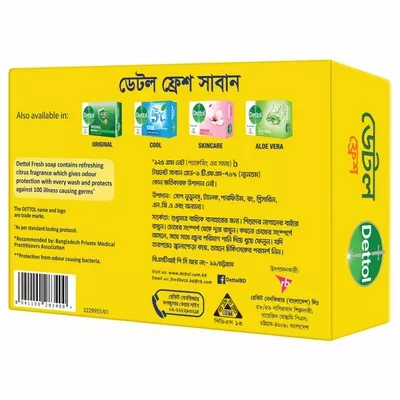Dettol soap Fresh bathing bar soap is a Grade-1 soap. It contains refreshing citrus fragrance. It gives odour protection with every wash. Be 100% sure. Get Dettol's trusted protection from a wide range of unseen germs. Dettol is recommended by Bangladesh Private Medical Practitioners Association (BPMPA). Available in Original, Cool, Skincare, Aloe Vera & Fresh variants.