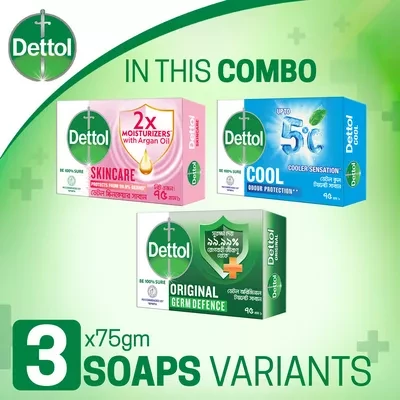 •Dettol Family Pack Soap contains 1 pc Original, 1 pc Cool and 1 pc Skincare 75gm Soap