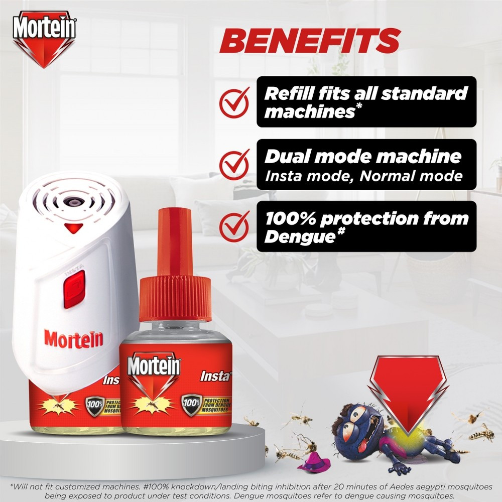 Contains 1 unit of Mortein Insta liquid vaporizer machine and 1 Mortein liquid refill (45ml). Lasts up